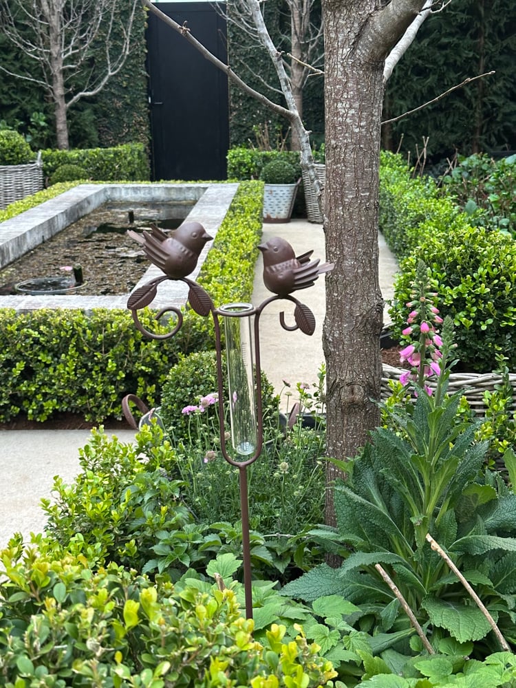 A super whimsical and practical iron rain gauge with 2 large birds and glass rain measuring tube (with measurements in cm and inches) in a dark brown finish