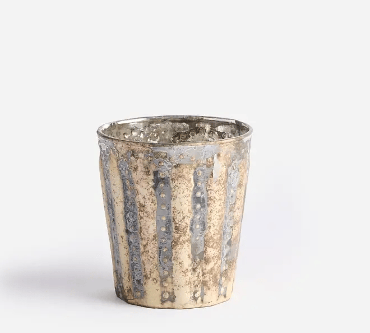 Handcrafted votives with broad vertical gold stripes and subtle gold detailing, finished with a softly aged mercury-silvered patina. Each unique piece casts a warm, elegant glow and is available in four sizes.