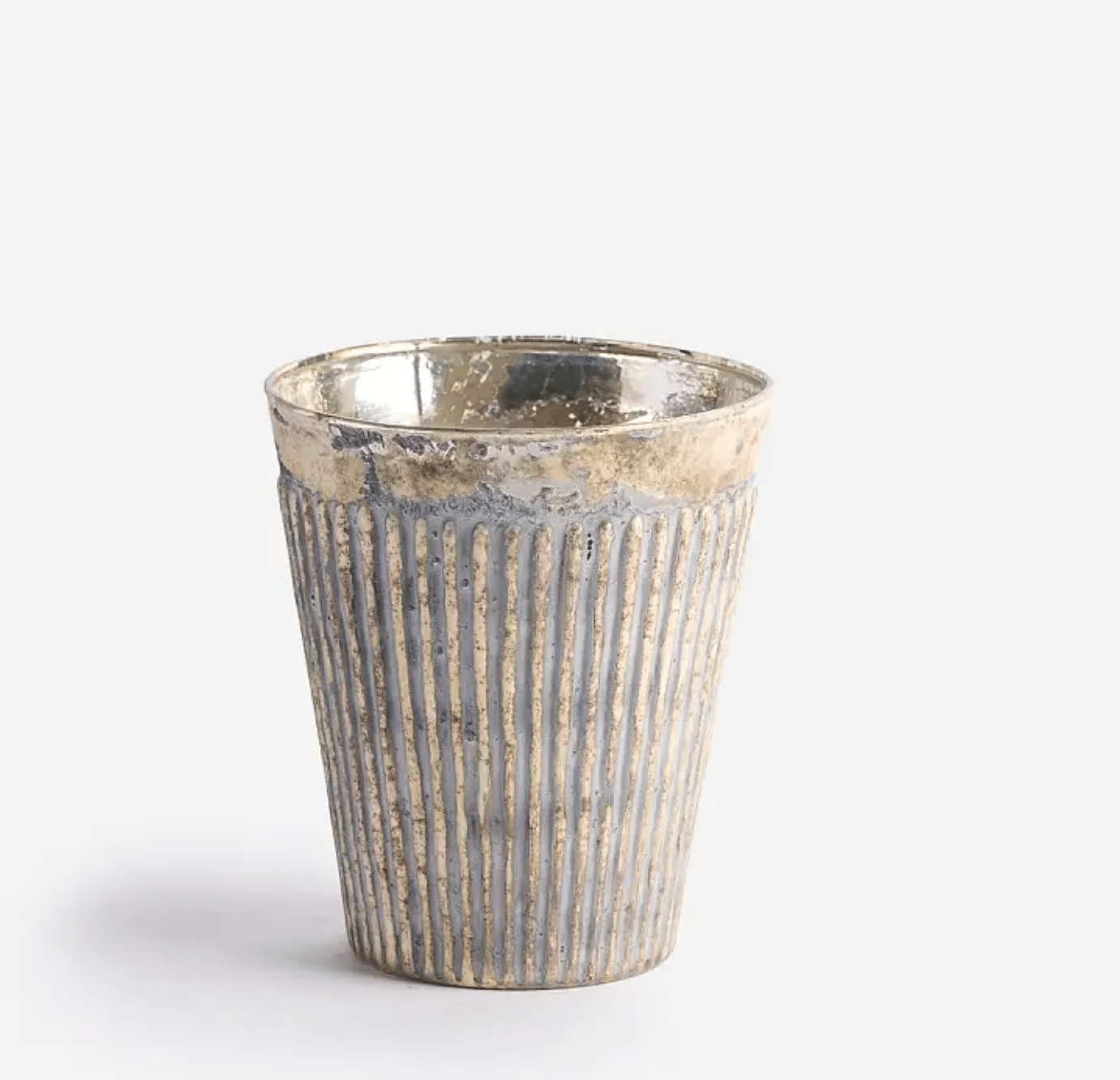 Handcrafted mercury-silvered votives with a refined conical shape and elegant gold embossed lines, each with its own softly aged patina. Available in three sizes, the collection brings a warm, sophisticated glow to any setting.