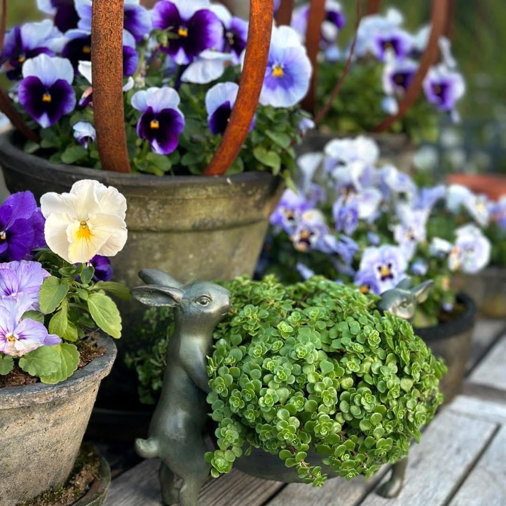 A curious pair of rabbits holding a small planter. Perfect for adding whimsy and charm