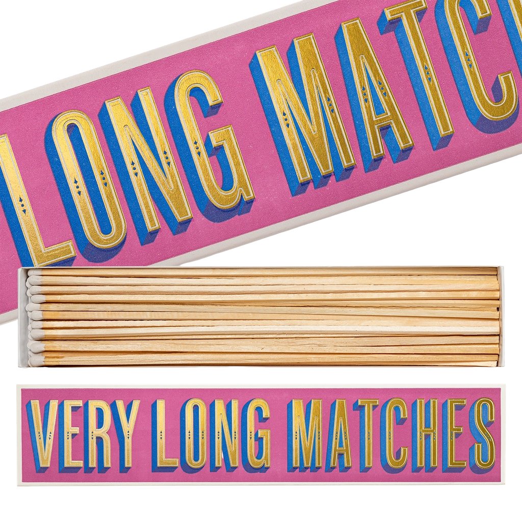 Our long matchbox featuring the words 'Very Long Matches' in gold foil with a two-tone blue shadow on a deep pink background.